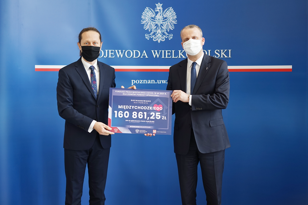 Wojewoda wielkopolski Michał Zieliński wręczył dziś okolicznościowe czeki dla domów pomocy społecznej. Środki pochodzą z Funduszu Przeciwdziałania COVID-19 na 2021 rok i zostały przyznane przez Ministerstwo Rodziny i Polityki Społecznej. W spotkaniu uczestniczył także poseł na Sejm Jan Mosiński.