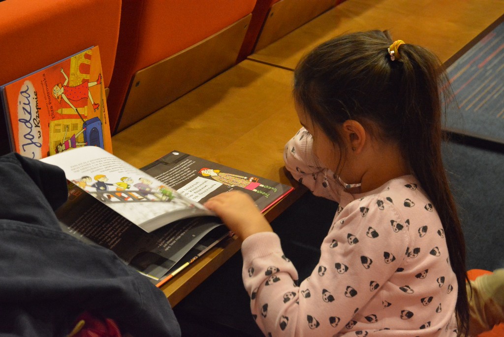 Chór gospel podczas występuRodzice i dzieci słuchają koncertuChór gospel podczas występuRodzice i dzieci słuchają koncertuWicewojewoda siedzi w pierwszym rzędzie na saliDziewczynka czyta książkę Elizy PiotrowskiejWidok książki Elizy PiotrowskiejWidok sali podczas spotkania autorskiegoEliza Piotrowska i chłopiecEliza Piotrowska - zbliżenieDzieci zadają pytania autorce książekZdjęcie grupowe z dziećmi