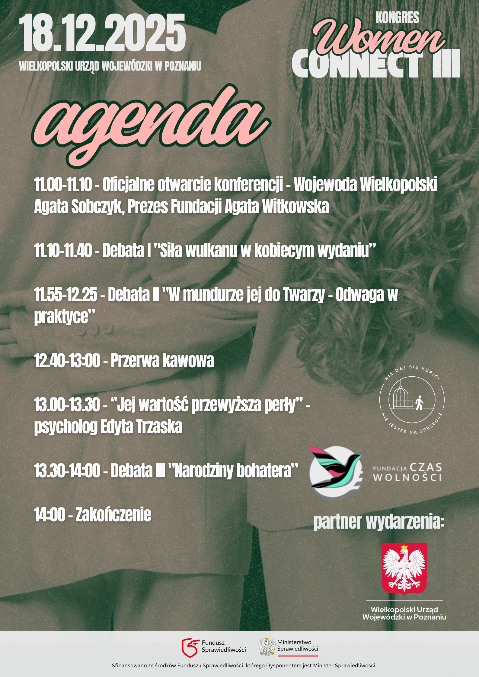 Już 18 grudnia w Sali Sesyjnej Wielkopolskiego Urzędu Wojewódzkiego w Poznaniu odbędzie się Kongres Kobiet Women Connect III, organizowany wspólnie z Fundacją Czas Wolności. To spotkanie stworzone z myślą o wzmacnianiu roli kobiet, budowaniu bezpiecznego społeczeństwa oraz rozwijaniu sieci wsparcia. Kongres jest otwarty dla wszystkich zainteresowanych, a jego formuła sprzyja wymianie doświadczeń, inspirowaniu się i tworzeniu wartościowych relacji.
