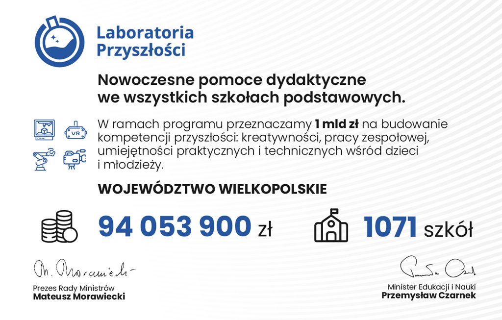 Samorządy otrzymywały na każdą szkołę od 30 000 zł do nawet kilkuset tysięcy (w zależności od liczby uczniów). W ramach Laboratoriów Przyszłości, każda szkoła podstawowa w Polsce zostanie wyposażona w nowoczesny sprzęt taki jak drukarki 3D, roboty edukacyjne czy gogle wirtualnej rzeczywistości. Do 1071 wielkopolskich szkół trafiło 94 053 900 zł, a program objął wsparciem 282 779 uczniów szkół podstawowych.