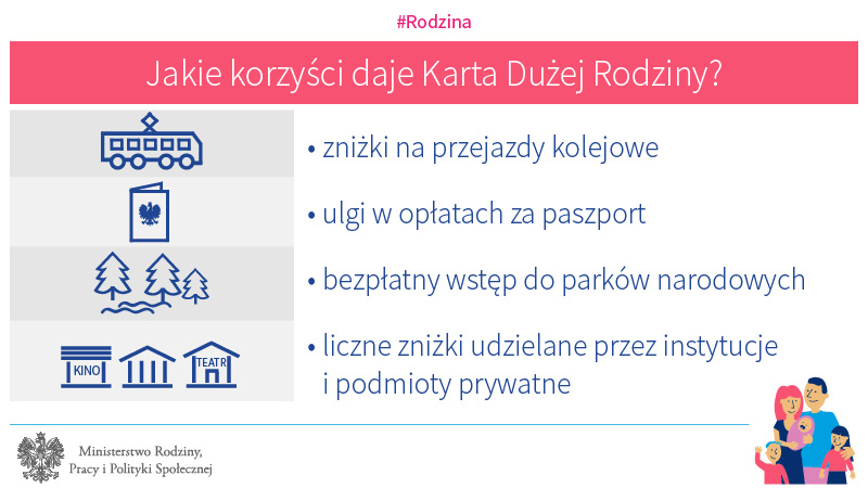 System zniżek i dodatkowych uprawnień dla rodzin 3+. Karta Dużej Rodziny funkcjonuje zarówno w instytucjach publicznych, jak i w prywatnych firmach.