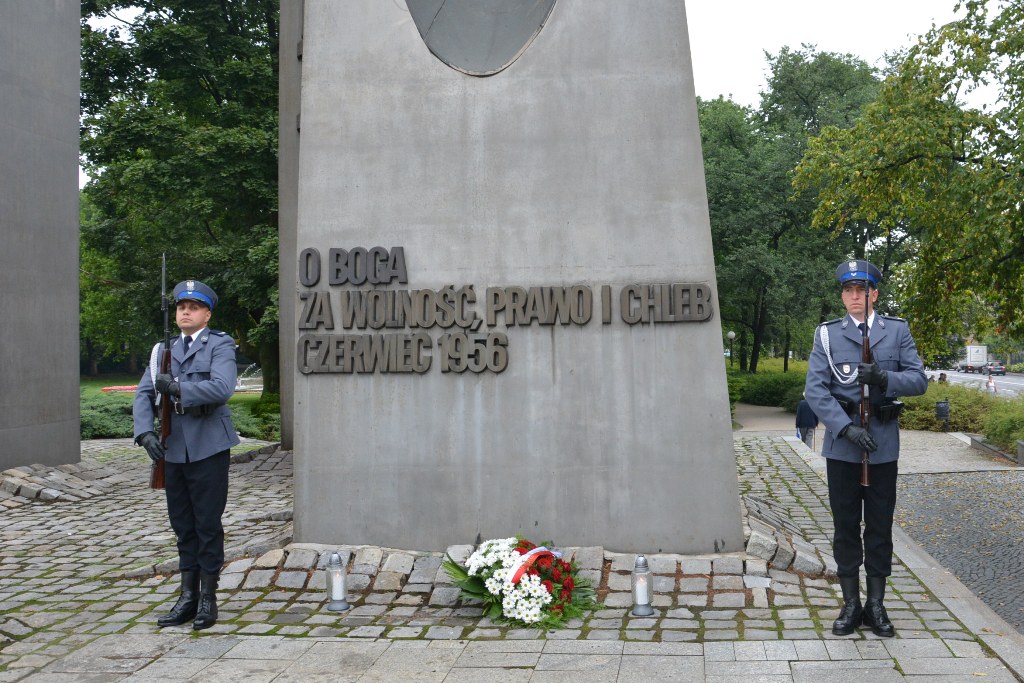 Wojewoda wraz z komendantami policji w drodze do złożenia kwiatów pod pomnikiem Czerwca 56.Wojewoda wraz z komendantami policji stoją przed pomnikiem Czerwca 56. Złożone kwiaty pod pomnikiem Czerwca 56.