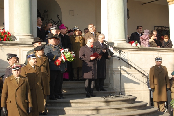 W wygłoszonym przemówieniu wojewoda podkreślał, że 11 listopada jest świętem radości, ale i obowiązku za Niepodległą Rzeczpospolitą, która wymaga naszego zaangażowania i pracy, naszej pomysłowości, przedsiębiorczości i wytrwałości, a także wiary w to, że wspólnie podejmowane wysiłki przyniosą oczekiwane wyniki. Mówiąc o bohaterach, którym zawdzięczamy niepodległość przypomniał słowa Jana Pawła II, który mówił: Nie chciejcie ojczyzny, która was nic nie kosztuje!.